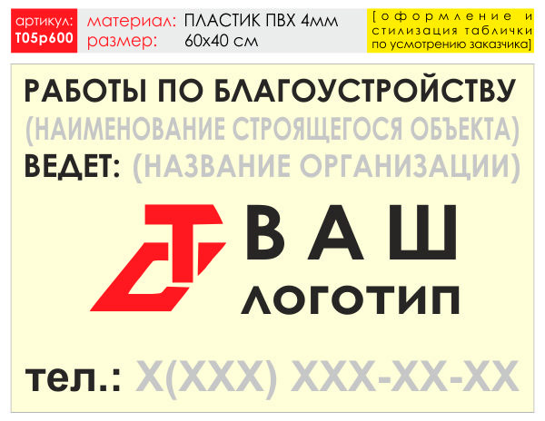 Баннер «Работы по благоустройству», T05 (пластик 4 мм, 60х40 см) в Верее купить