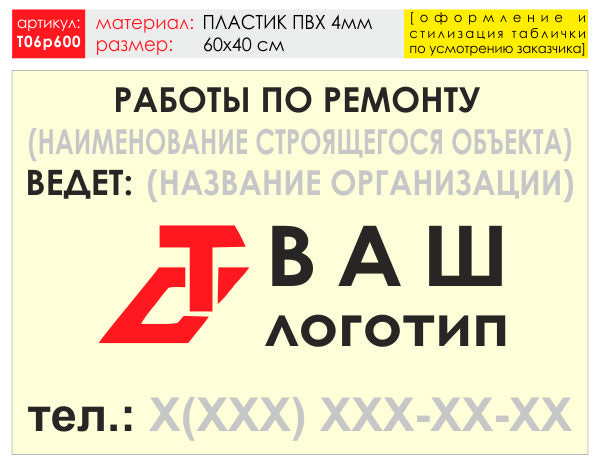 Баннер «Работы по ремонту», T06 (пластик 4 мм, 60х40 см) в Верее купить