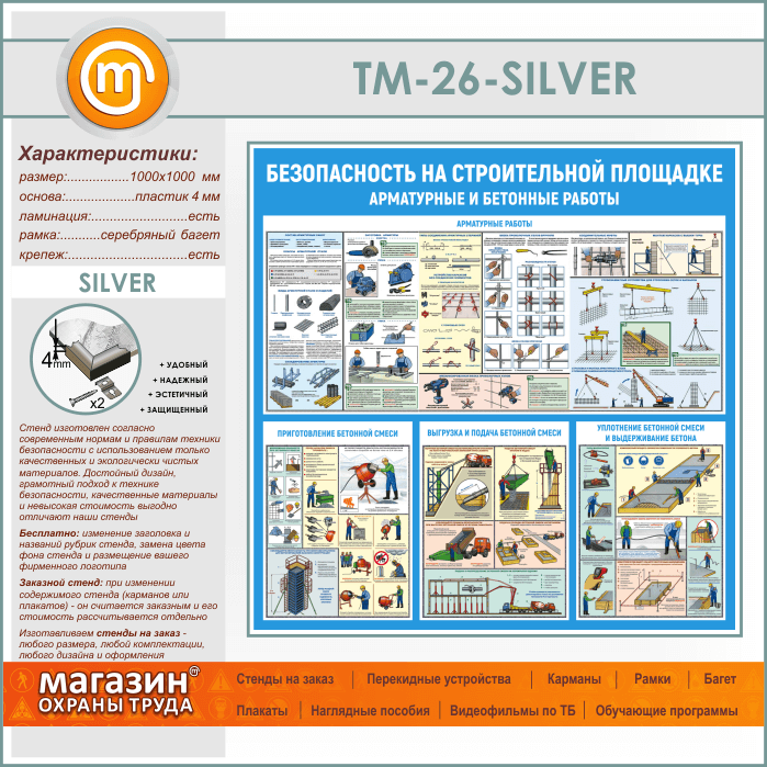 Стенд «Безопасность на строительной площадке. Арматурные и бетонные работы» (TM-26-SILVER) в Верее купить
