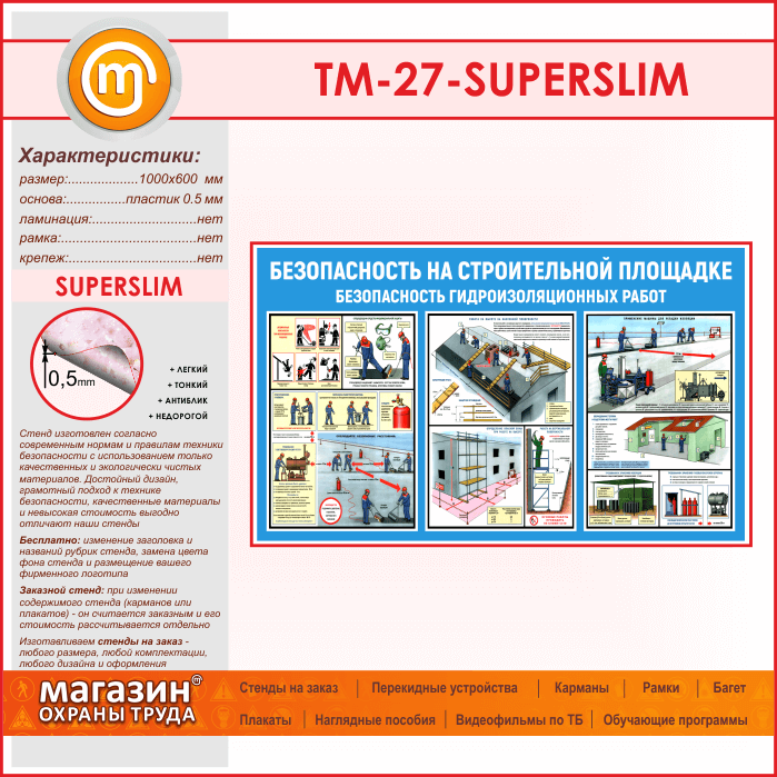 Стенд «Безопасность на строительной площадке. Безопасность гидроизоляционных работ» (TM-27-SUPERSLIM) в Верее купить