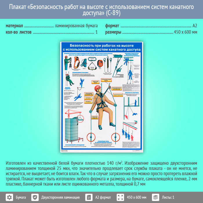 Плакат «Безопасность работ на высоте с использованием систем канатного доступа» (С-89, ламинированная бумага, А2, 1 лист) в Верее купить