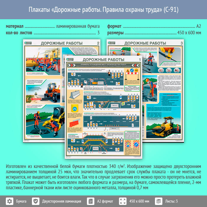 Плакаты «Дорожные работы. Правила охраны труда» (С-91, ламинированная бумага, А2, 3 листа) в Верее купить