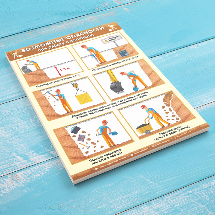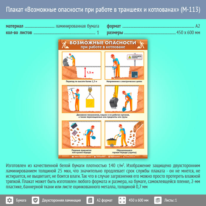 Плакат «Возможные опасности при работе в траншеях и котлованах» (М-113, ламинированная бумага, А2, 1 лист) в Верее купить
