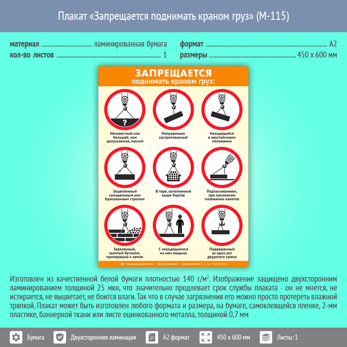 Плакат «Запрещается поднимать краном груз» (М-115, ламинированная бумага, А2, 1 лист) в Верее купить
