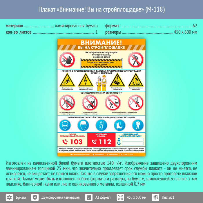 Плакат «Внимание! Вы на стройплощадке» (М-118, ламинированная бумага, А2, 1 лист) в Верее купить