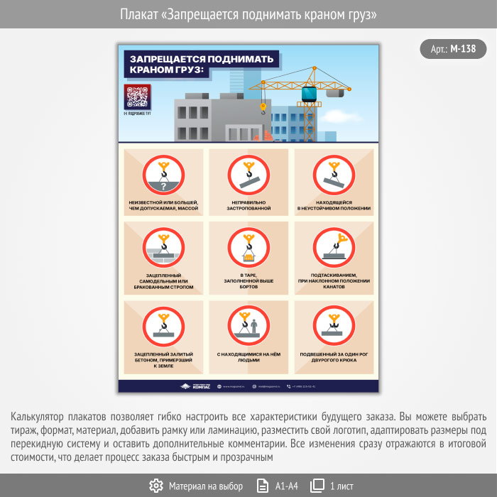 Плакат «Запрещается поднимать краном груз» с QR (М-138, 1 лист) в Верее купить