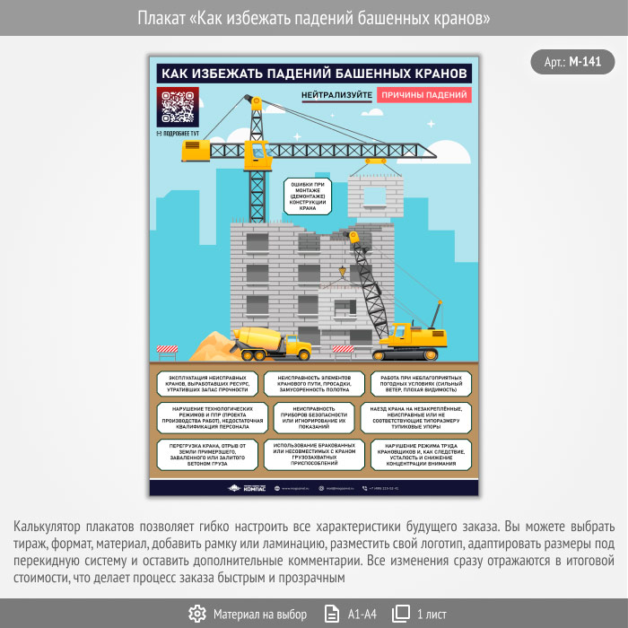 Плакат «Как избежать падений башенных кранов» с QR (М-141, 1 лист) в Верее купить