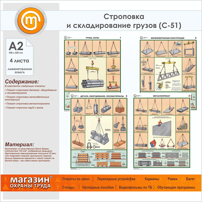 Плакаты «Строповка и складирование грузов» (С-51, ламинированная бумага, А2, 4 листа) в Верее купить