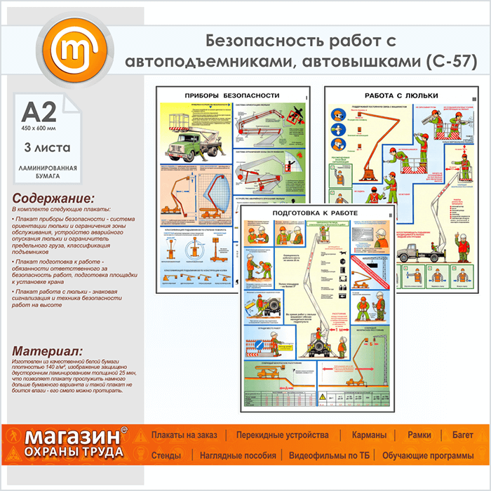 Плакаты «Безопасность работ с автоподъемниками, автовышками» (С-57, ламинированная бумага, А2, 3 листа) в Верее купить