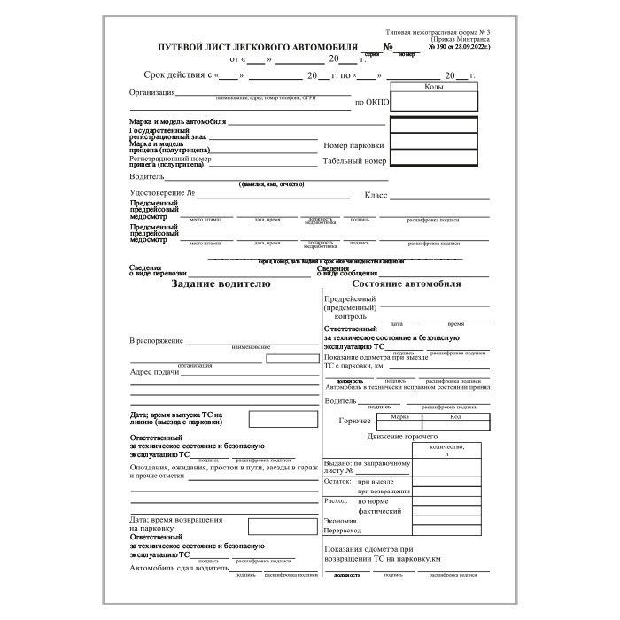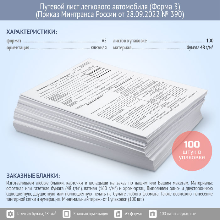Путевой лист легкового автомобиля (Форма № 3) (Приказ Минтранса России от 28.09.2022 № 390) (упаковка из 100 штук) в Верее купить