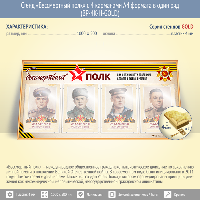 Стенд «Бессмертный полк» с 4 карманами А4 формата в один ряд (BP-4K-H-GOLD) в Верее купить