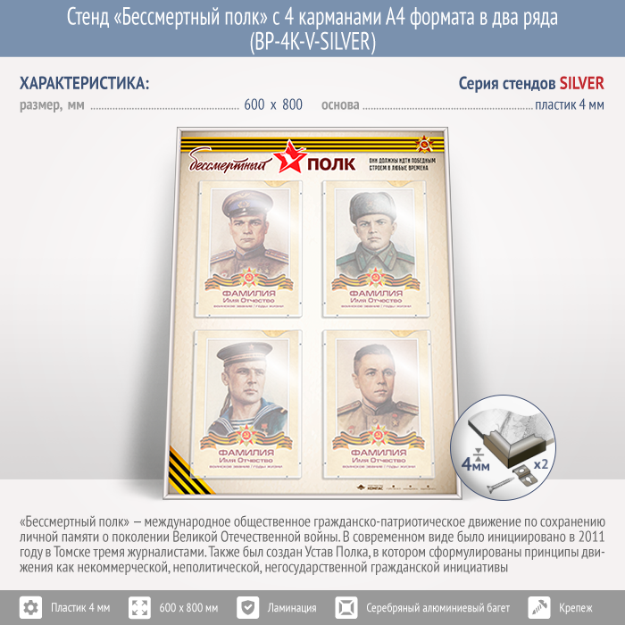 Стенд «Бессмертный полк» с 4 карманами А4 формата в два ряда (BP-4K-V-SILVER) в Верее купить