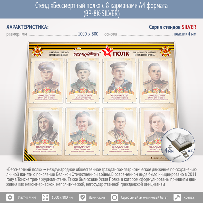 Стенд «Бессмертный полк» с 8 карманами А4 формата (BP-8K-SILVER) в Верее купить