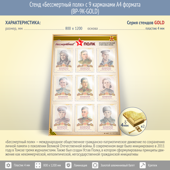 Стенд «Бессмертный полк» с 9 карманами А4 формата (BP-9K-GOLD) в Верее купить