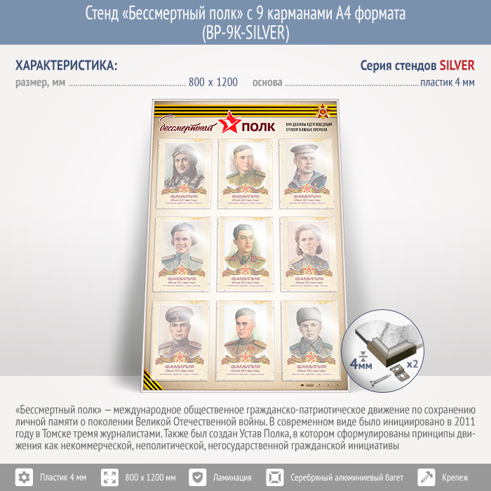 Стенд «Бессмертный полк» с 9 карманами А4 формата (BP-9K-SILVER) в Верее купить