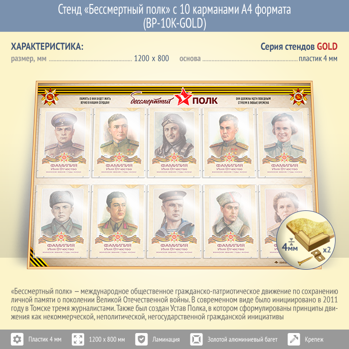 Стенд «Бессмертный полк» с 10 карманами А4 формата (BP-10K-GOLD) в Верее купить