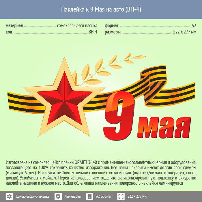 Наклейка к 9 Мая на авто А2 формата (BH-4) в Верее купить