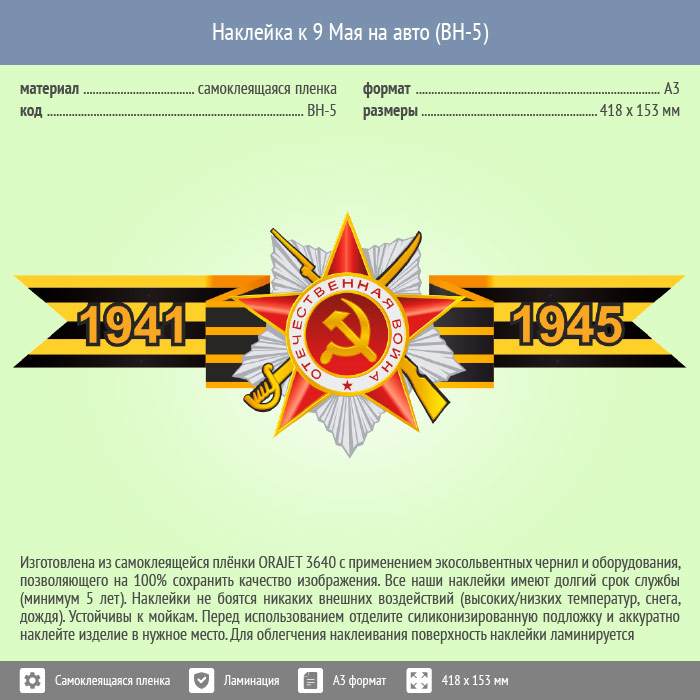 Наклейка к 9 Мая на авто А3 формата (BH-5) в Верее купить