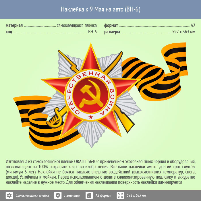 Наклейка к 9 Мая на авто А2 формата (BH-6) в Верее купить