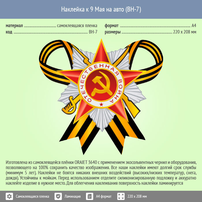 Наклейка к 9 Мая на авто А4 формата (BH-7) в Верее купить