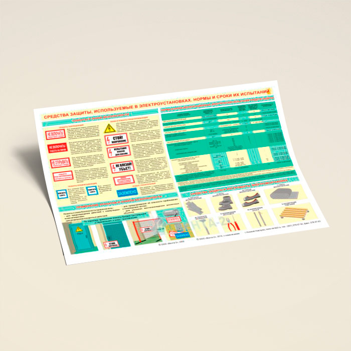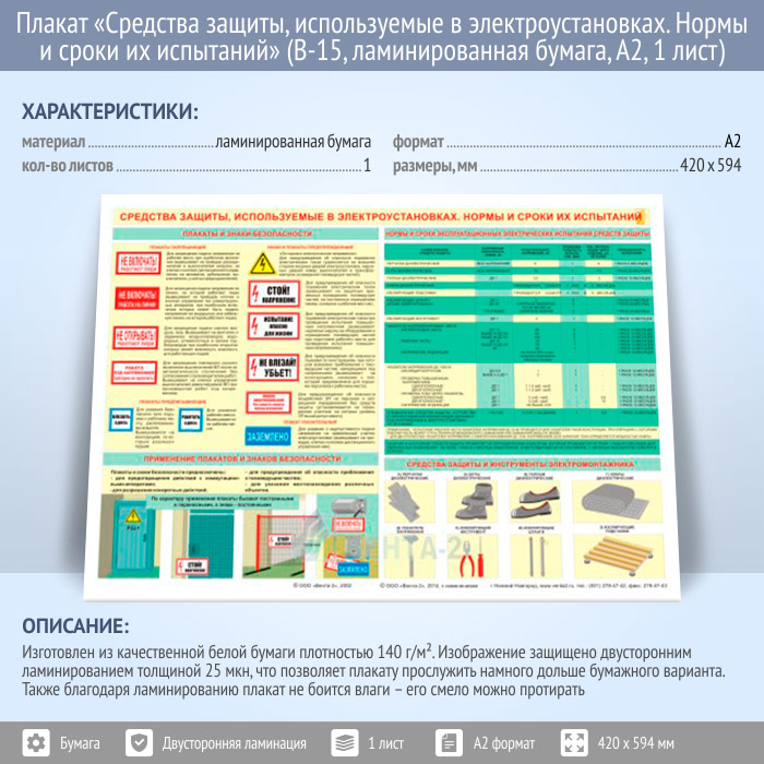 Плакат «Средства защиты, используемые в электроустановках. Нормы и сроки их испытаний» (В-15, ламинированная бумага, А2, 1 лист) в Верее купить
