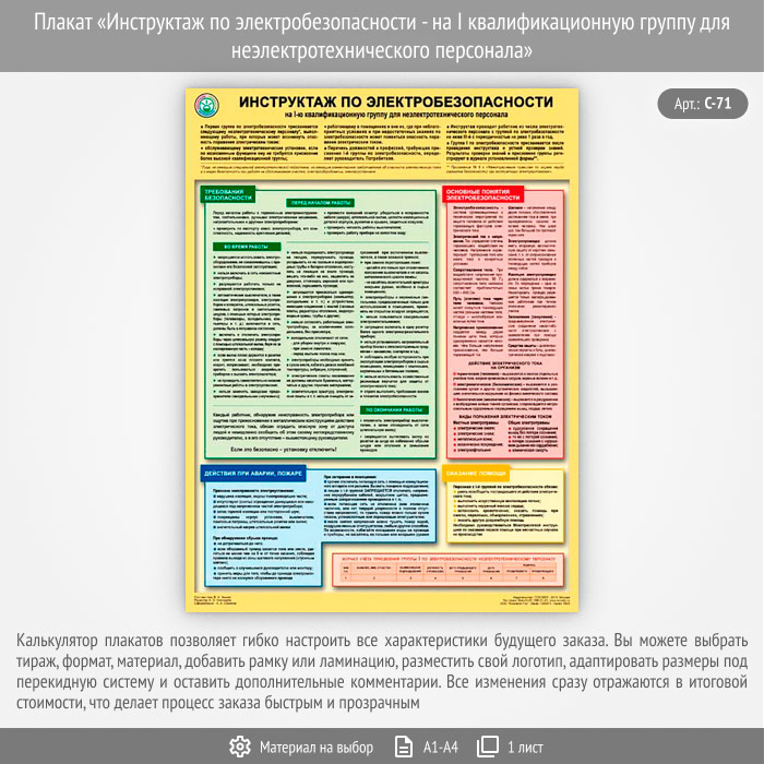 Плакат «Инструктаж по электробезопасности - на I квалификационную группу для неэлектротехнического персонала» (С-71, 1 лист) в Верее купить