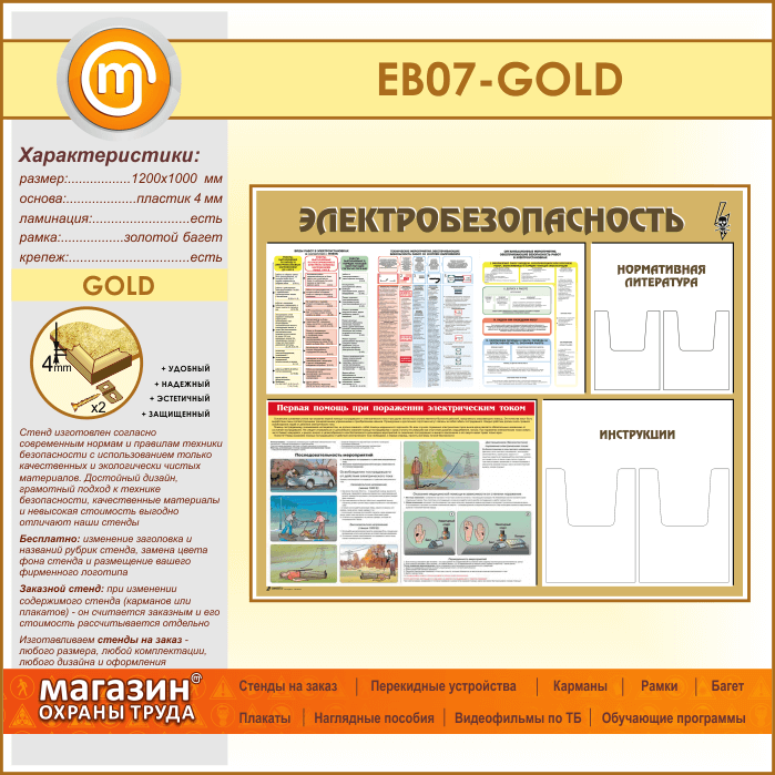 Стенд «Электробезопасность» с 4 объемными карманами (EB-07-GOLD) в Верее купить