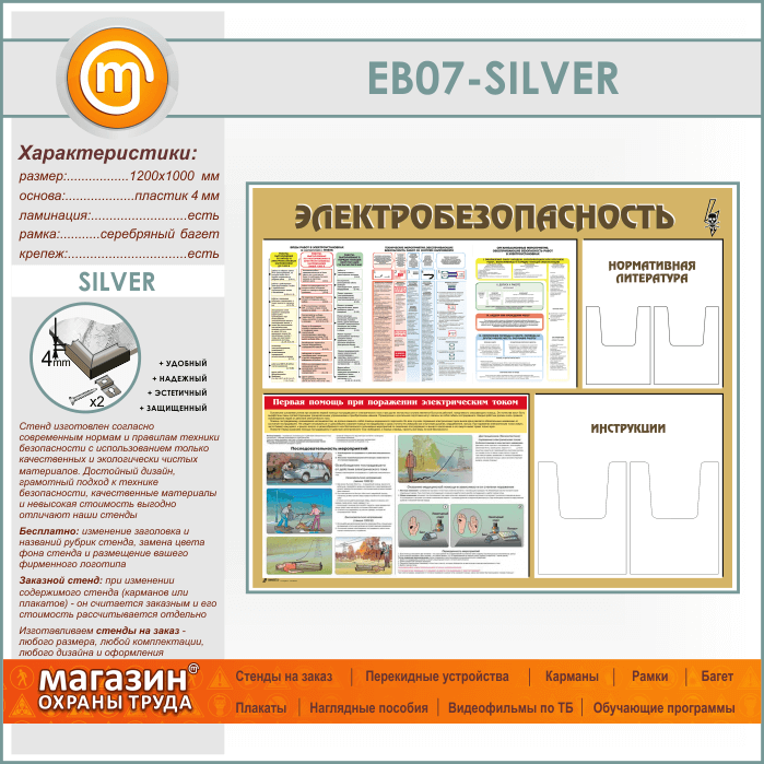 Стенд «Электробезопасность» с 4 объемными карманами (EB-07-SILVER) в Верее купить