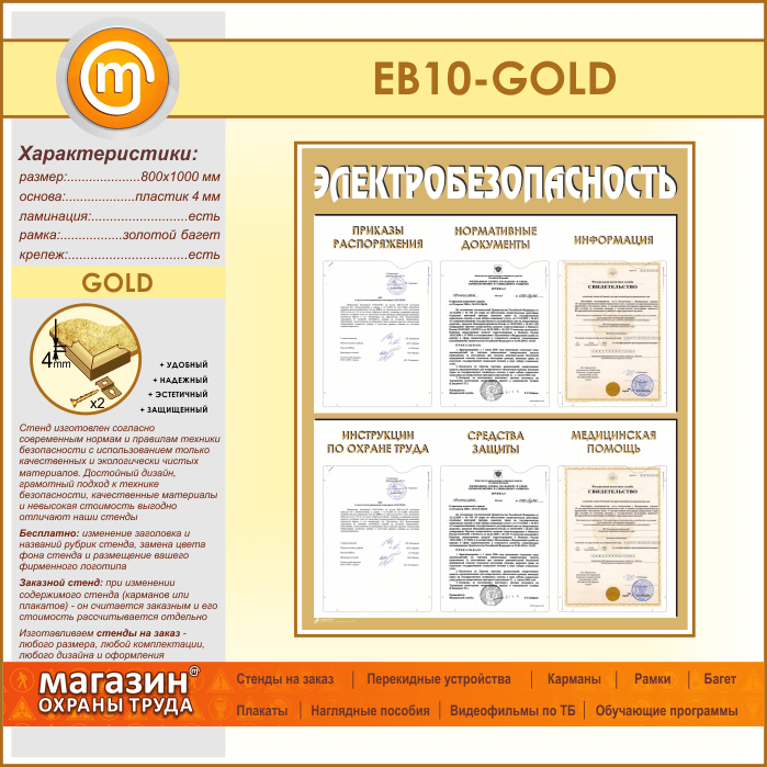 Стенд «Электробезопасность» с 6 карманами (EB-10-GOLD) в Верее купить