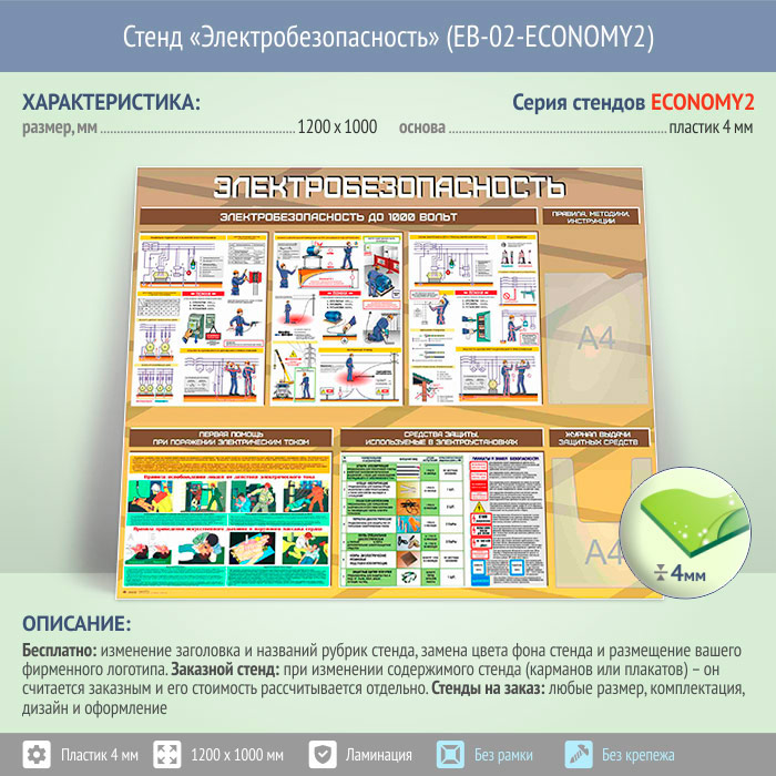 Стенд «Электробезопасность до 1000 вольт» с плоским и объемным карманами (EB-02-ECONOMY2) в Верее купить