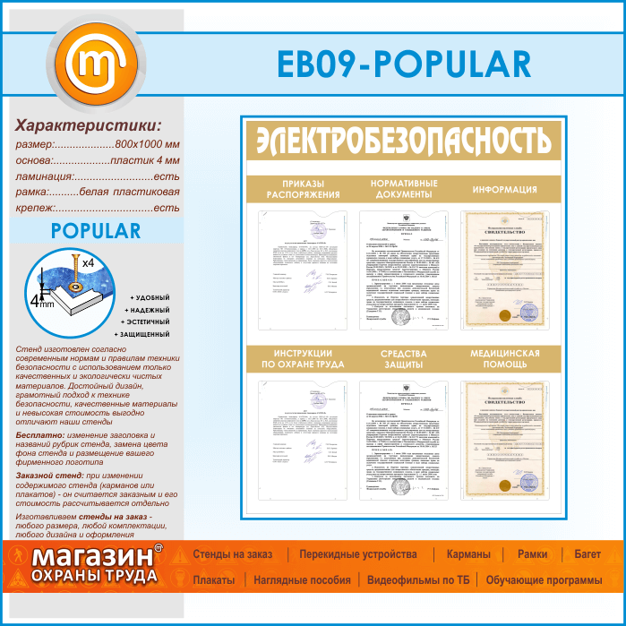 Стенд «Электробезопасность» с 6 карманами (EB-09-POPULAR) в Верее купить
