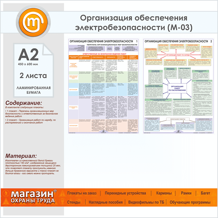 Плакаты «Организация обеспечения электробезопасности» (М-03, ламинированная бумага, А2, 2 листа) в Верее купить