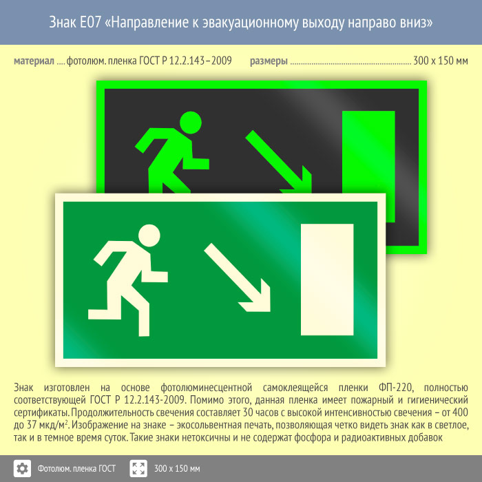 Знак E07 «Направление к эвакуационному выходу направо вниз» (фотолюминесцентная пленка ГОСТ 34428-2018, 300х150 мм) в Верее купить