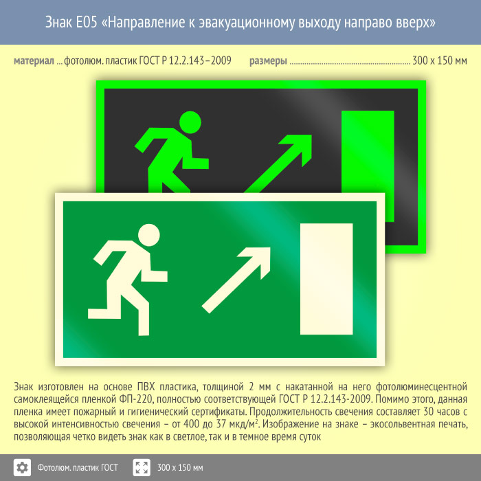 Знак E05 «Направление к эвакуационному выходу направо вверх» (фотолюминесцентный пластик ГОСТ 34428-2018, 300х150 мм) в Верее купить