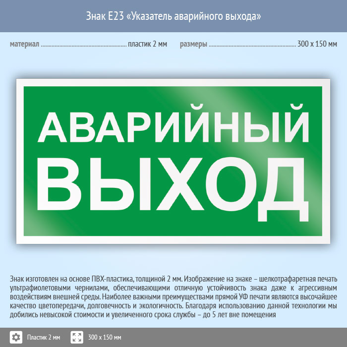 Знак E23 «Указатель аварийного выхода» (пластик, 300х150 мм) в Верее купить