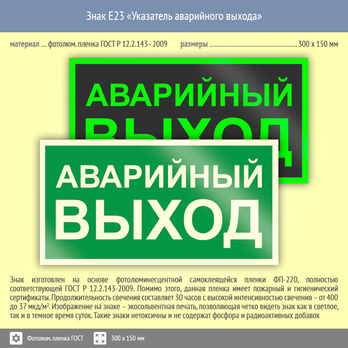 Знак E23 «Указатель аварийного выхода» (фотолюминесцентная пленка ГОСТ 34428-2018, 300х150 мм) в Верее купить