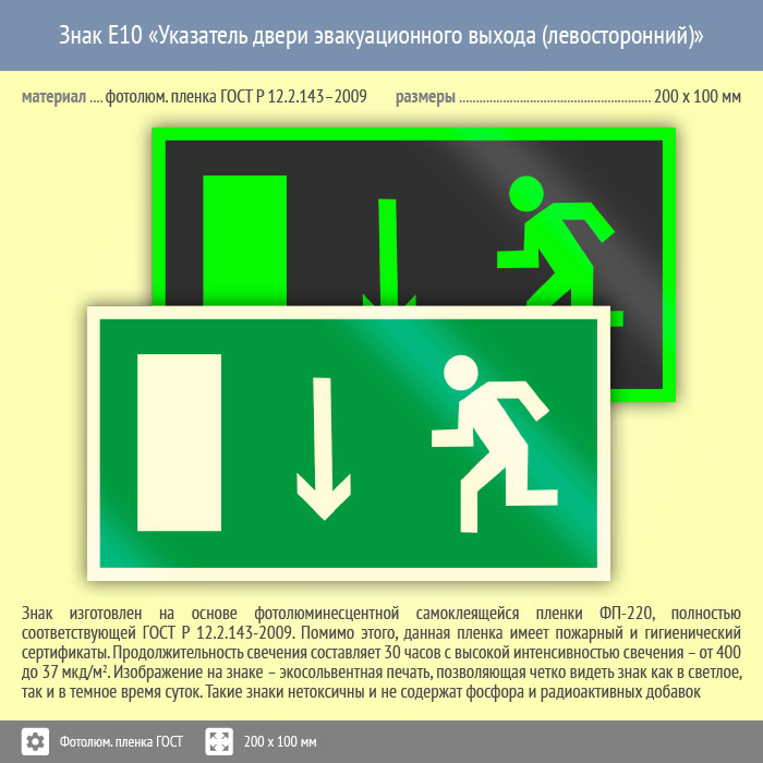 Знак E10 «Указатель двери эвакуационного выхода (левосторонний)» (фотолюминесцентная пленка ГОСТ 34428-2018, 200х100 мм) в Верее купить