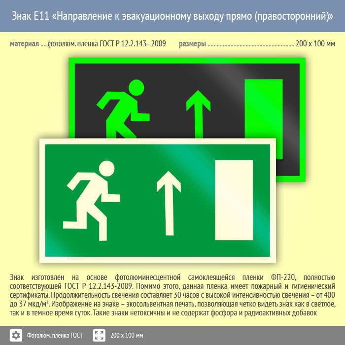 Знак E11 «Направление к эвакуационному выходу прямо (правосторонний)» (фотолюминесцентная пленка ГОСТ 34428-2018, 200х100 мм) в Верее купить