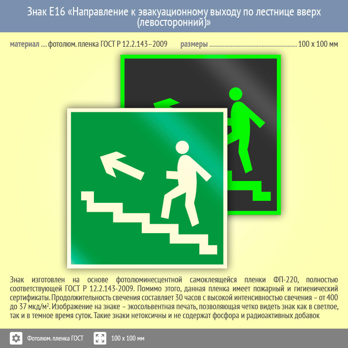 Знак E16 «Направление к эвакуационному выходу по лестнице вверх (левосторонний)» (фотолюминесцентная пленка ГОСТ 34428-2018, 100х100 мм) в Верее купить