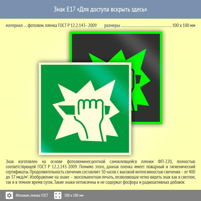 Знак E17 «Для доступа вскрыть здесь» (фотолюминесцентная пленка ГОСТ 34428-2018, 100х100 мм) в Верее купить