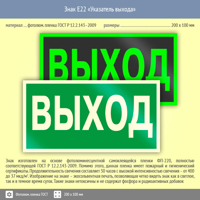 Знак E22 «Указатель выхода» (фотолюминесцентная пленка ГОСТ 34428-2018, 200х100 мм) в Верее купить