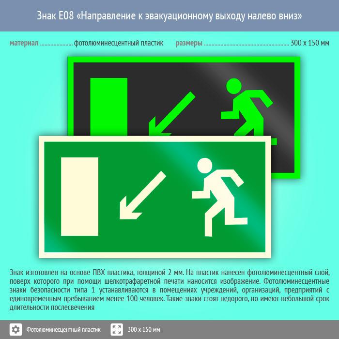 Знак E08 «Направление к эвакуационному выходу налево вниз» (фотолюминесцентный пластик, 300х150 мм) в Верее купить