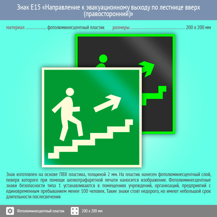 Знак E15 «Направление к эвакуационному выходу по лестнице вверх (правосторонний)» (фотолюминесцентный пластик, 200х200 мм) в Верее купить