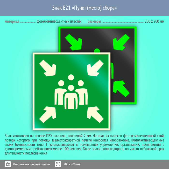 Знак E21 «Пункт (место) сбора» (фотолюминесцентный пластик, 200х200 мм) в Верее купить