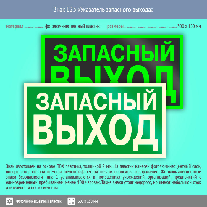 Знак E23 «Указатель запасного выхода» (устаревший) (фотолюминесцентный пластик, 300х150 мм) в Верее купить