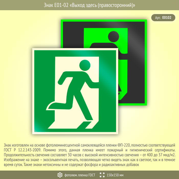 Знак E01-02 «Выход здесь (правосторонний)» (фотолюминесцентная пленка ГОСТ 34428-2018, 150х150 мм) в Верее купить