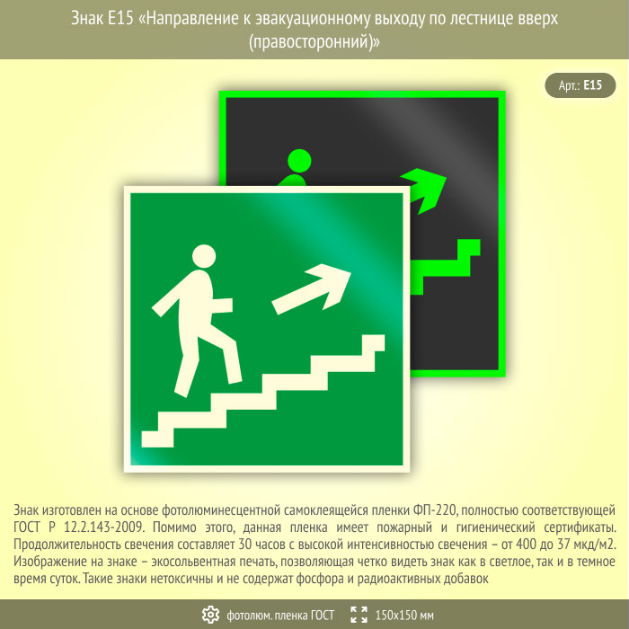 Знак E15 «Направление к эвакуационному выходу по лестнице вверх (правосторонний)» (фотолюминесцентная пленка ГОСТ 34428-2018, 150х150 мм) в Верее купить