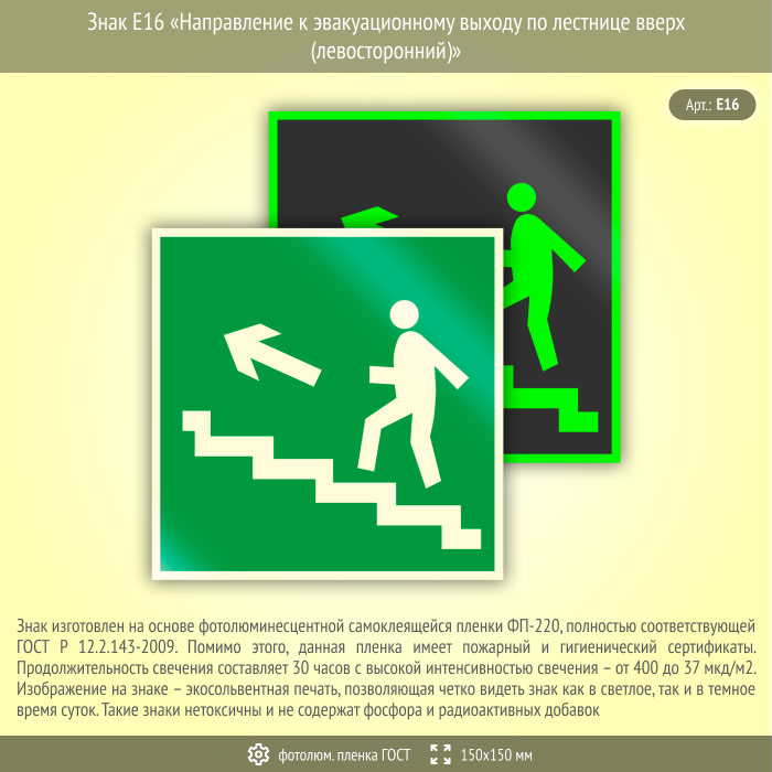 Знак E16 «Направление к эвакуационному выходу по лестнице вверх (левосторонний)» (фотолюминесцентная пленка ГОСТ 34428-2018, 150х150 мм) в Верее купить