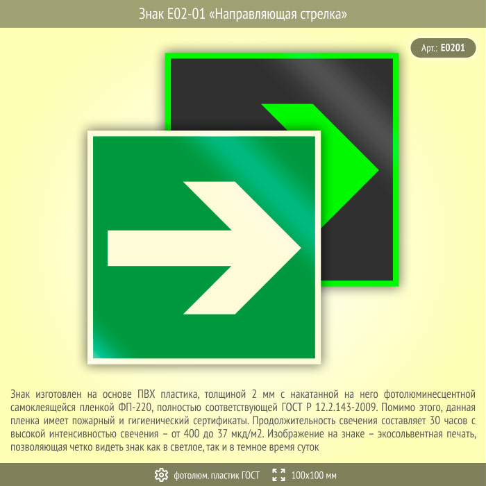 Знак E02-01 «Направляющая стрелка» (фотолюминесцентный пластик ГОСТ 34428-2018, 100х100 мм) в Верее купить