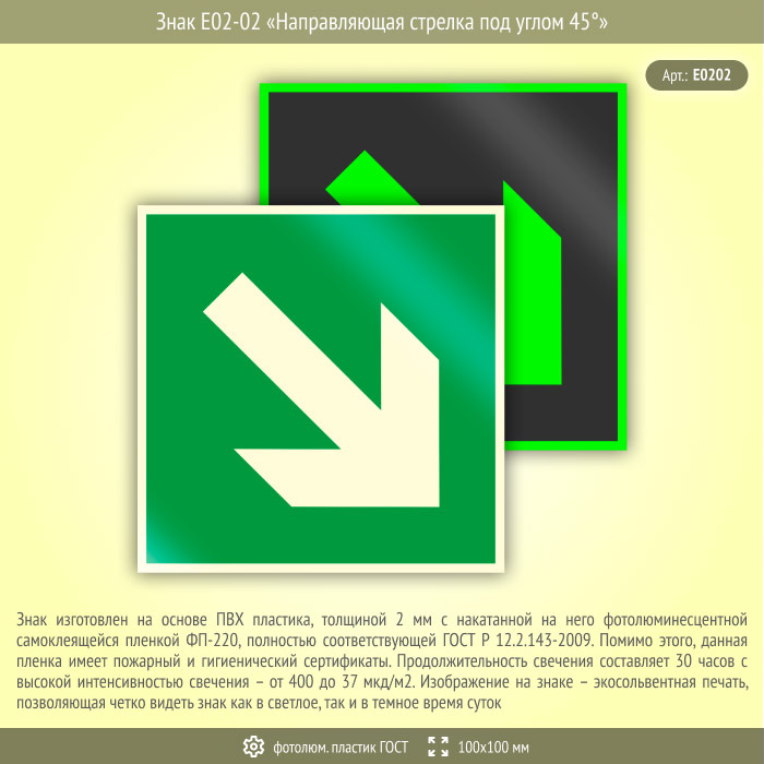 Знак E02-02 «Направляющая стрелка под углом 45°» (фотолюминесцентный пластик ГОСТ 34428-2018, 100х100 мм) в Верее купить